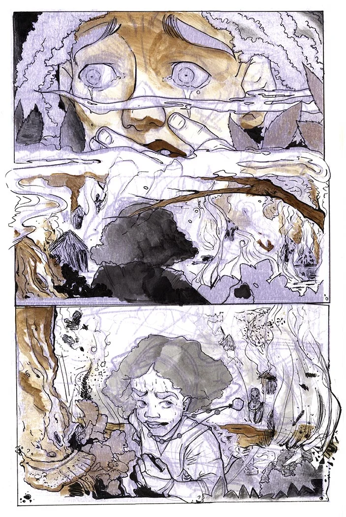 Some early examples of my pages, layout studies, and character development sketches.